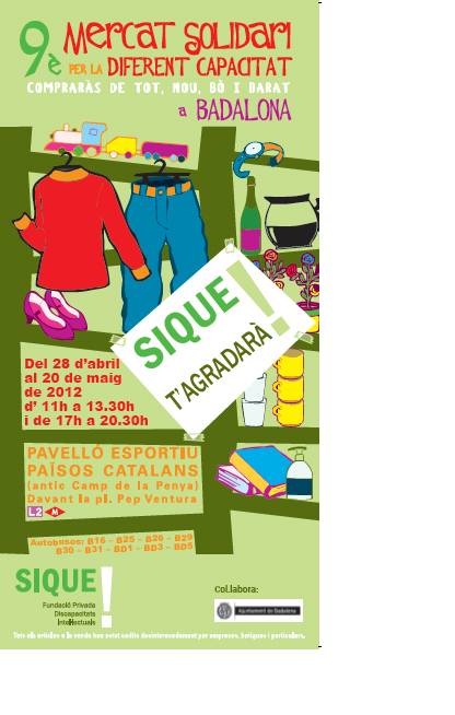Aquest dissabte 28 d’Abril a la Fundació SIQUE! encetem una nova edició del ja tradicional Mercat Solidari per a la Diferent Capacitat. En aquesta ocasió es tracta de la novena vegada que posem a la venda tots els articles i productes cedits per a diferents empreses de Catalunya.